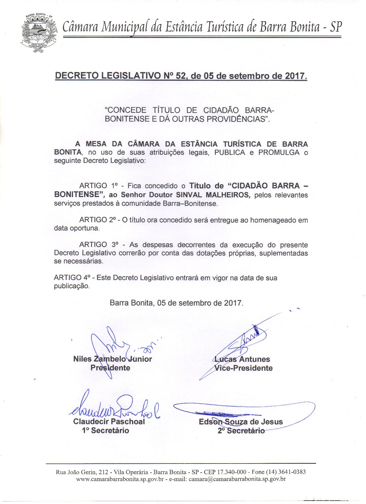 CONCEDE TÍTULO DE CIDADÃO BARRA-BONITENSE E DÁ OUTRAS PROVIDÊNCIAS. Ao Sr. Doutor SINVAL MALHEIROS Autoria: Sandro Roberto Alponte |