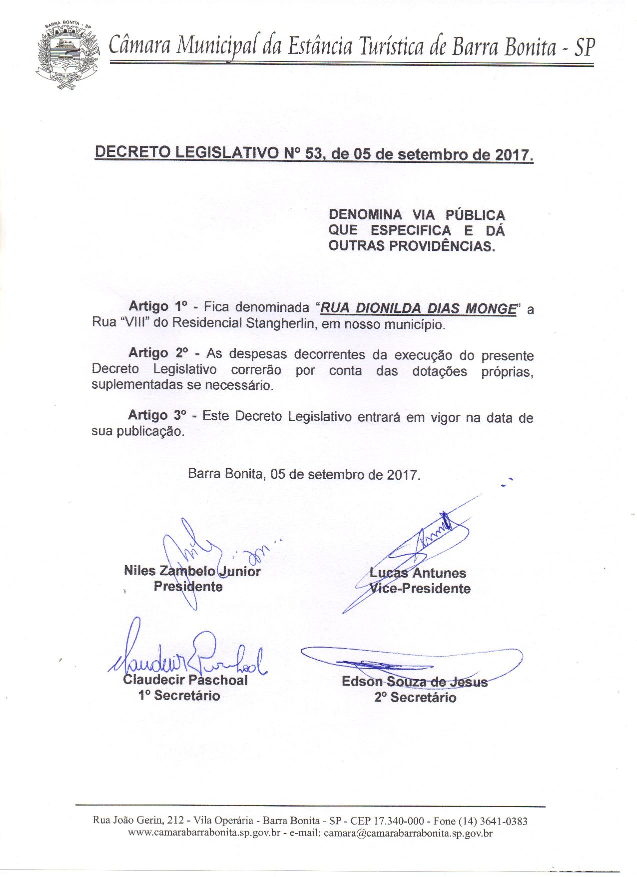 DENOMINA VIA PÚBLICA QUE ESPECIFICA E DÁ OUTRAS PROVIDÊNCIAS. “RUA DIONILDA DIAS MONGE” a Rua “VIII” do Residencial Stangherlin