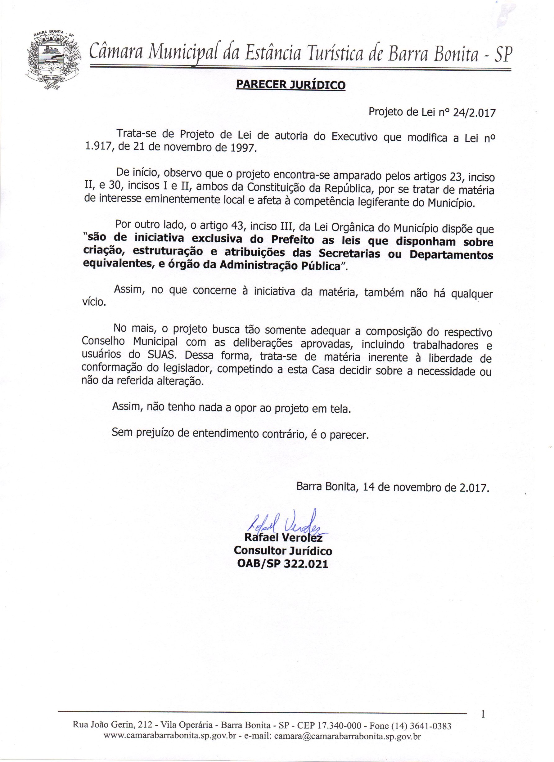Parecer ao Projeto de Lei Nº 24/2017 - DÁ NOVA REDAÇÃO AO ARTIGO 2°DA LEI N°1.917, DE 21 DE NOVEMBRO DE 1997, QUE ''DISPÕE SOBRE A INSTITUIÇÃO DO CONSELHO MUNICIPAL DE ASSISTÊNCIA SOCIAL''