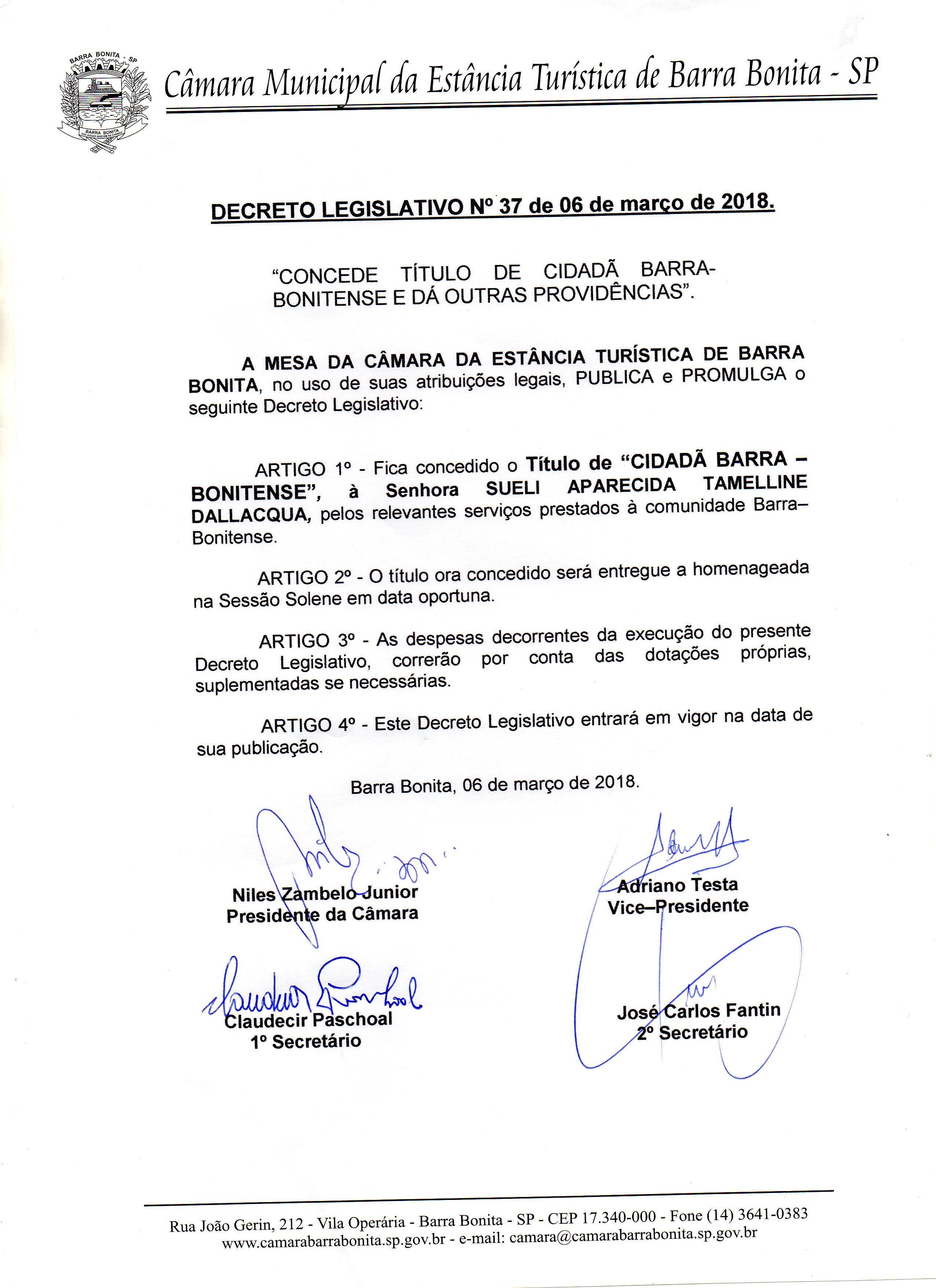 “CONCEDE TÍTULO DE CIDADÃ BARRA-BONITENSE E DÁ OUTRAS PROVIDÊNCIAS”. Sueli Aparecida Tamelline Dallacqua