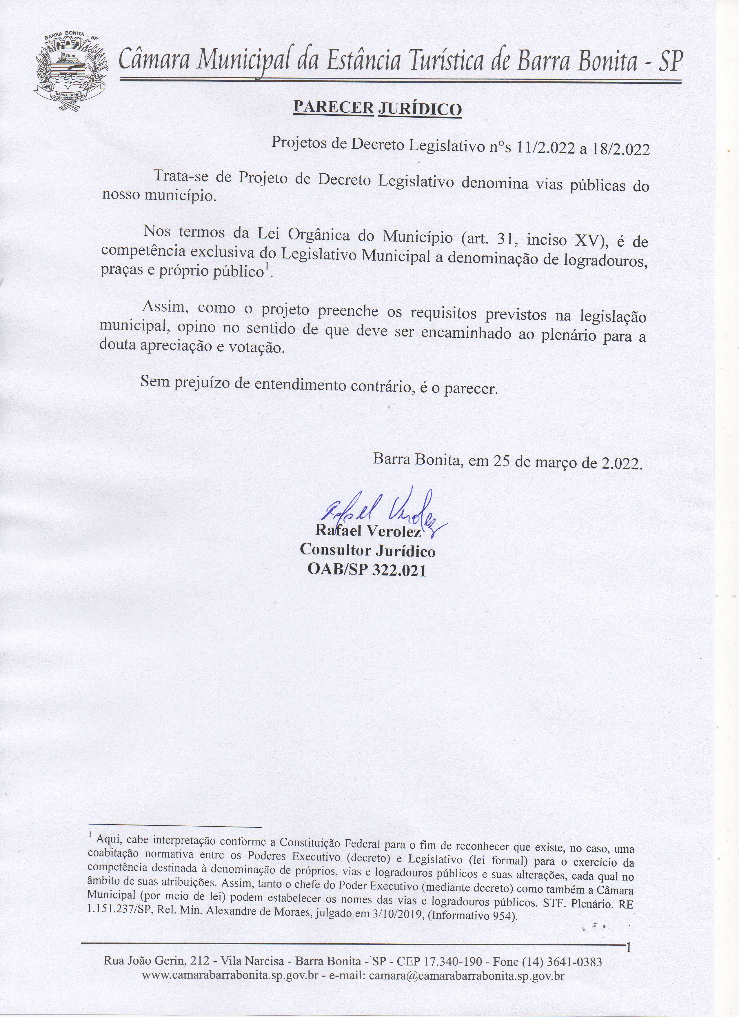 Assunto: Parecer Jurídico ao Projeto de Decreto Legislativo Nº 18/2022 - DENOMINA VIA PÚBLICA QUE ESPECIFICA E DÁ OUTRAS PROVIDÊNCIAS.