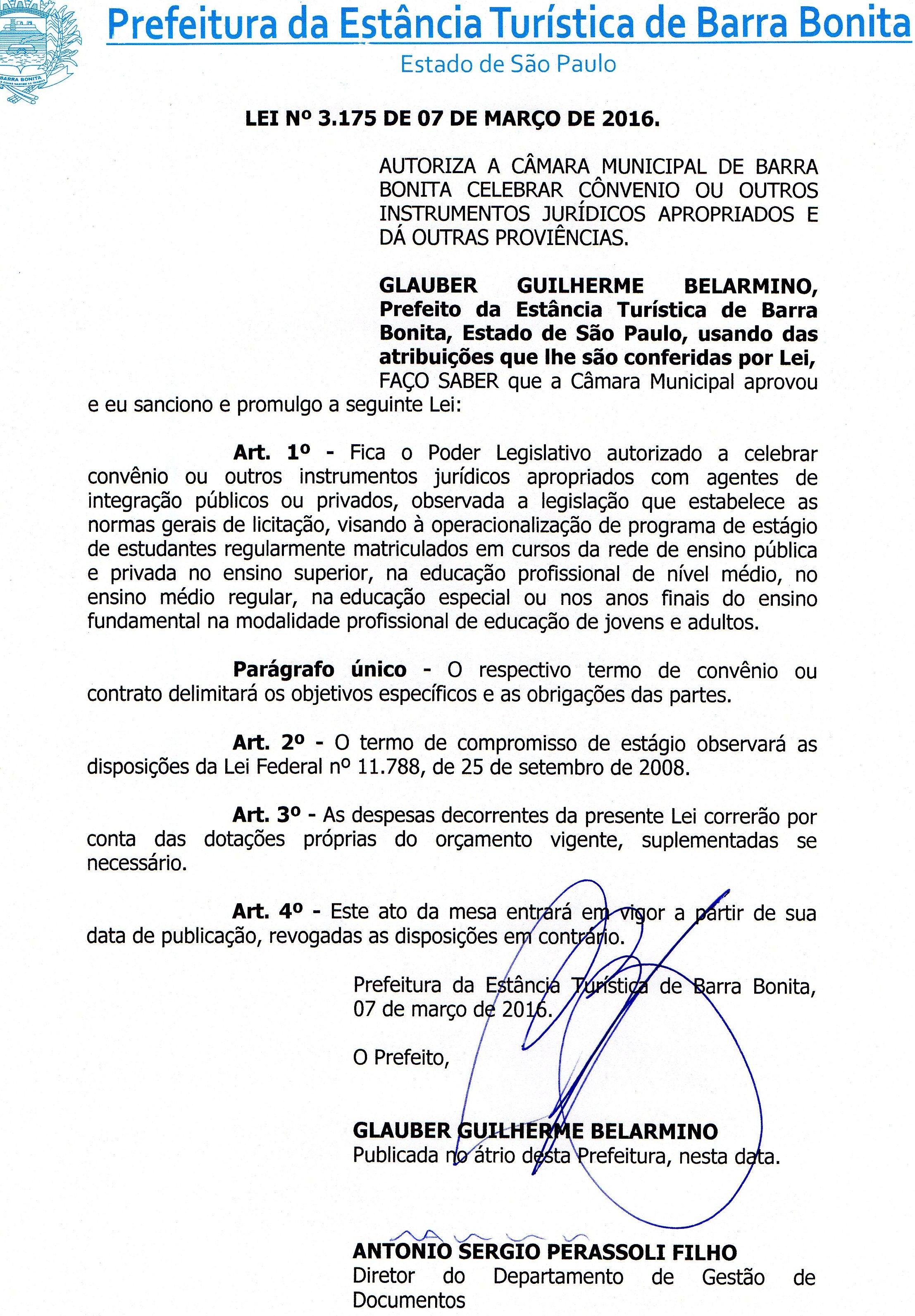 | Lei Ordinária Nº 3175 | 07/03/2016 |