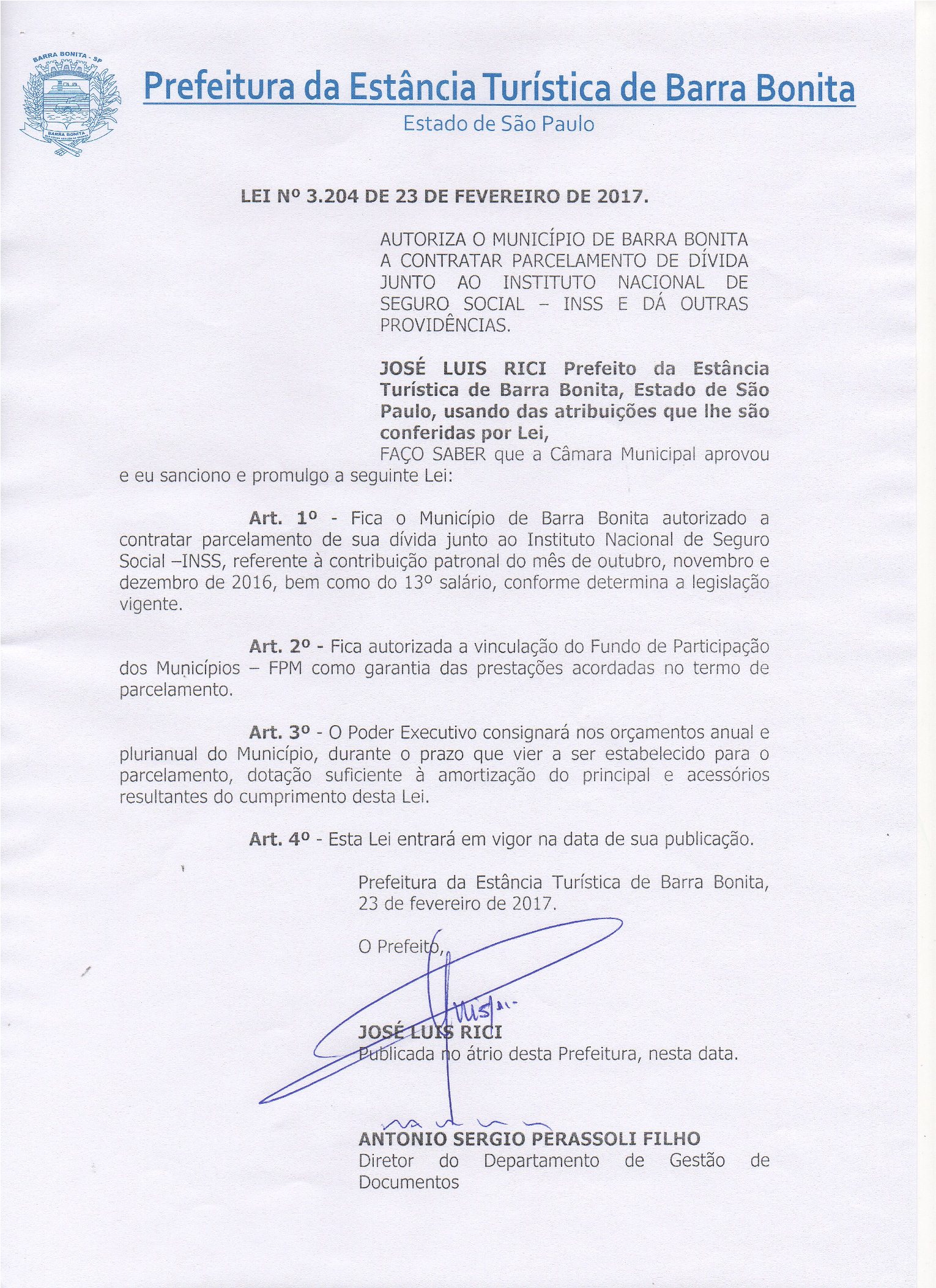 | Lei Ordinária Nº 3204 | 23/02/2017 |