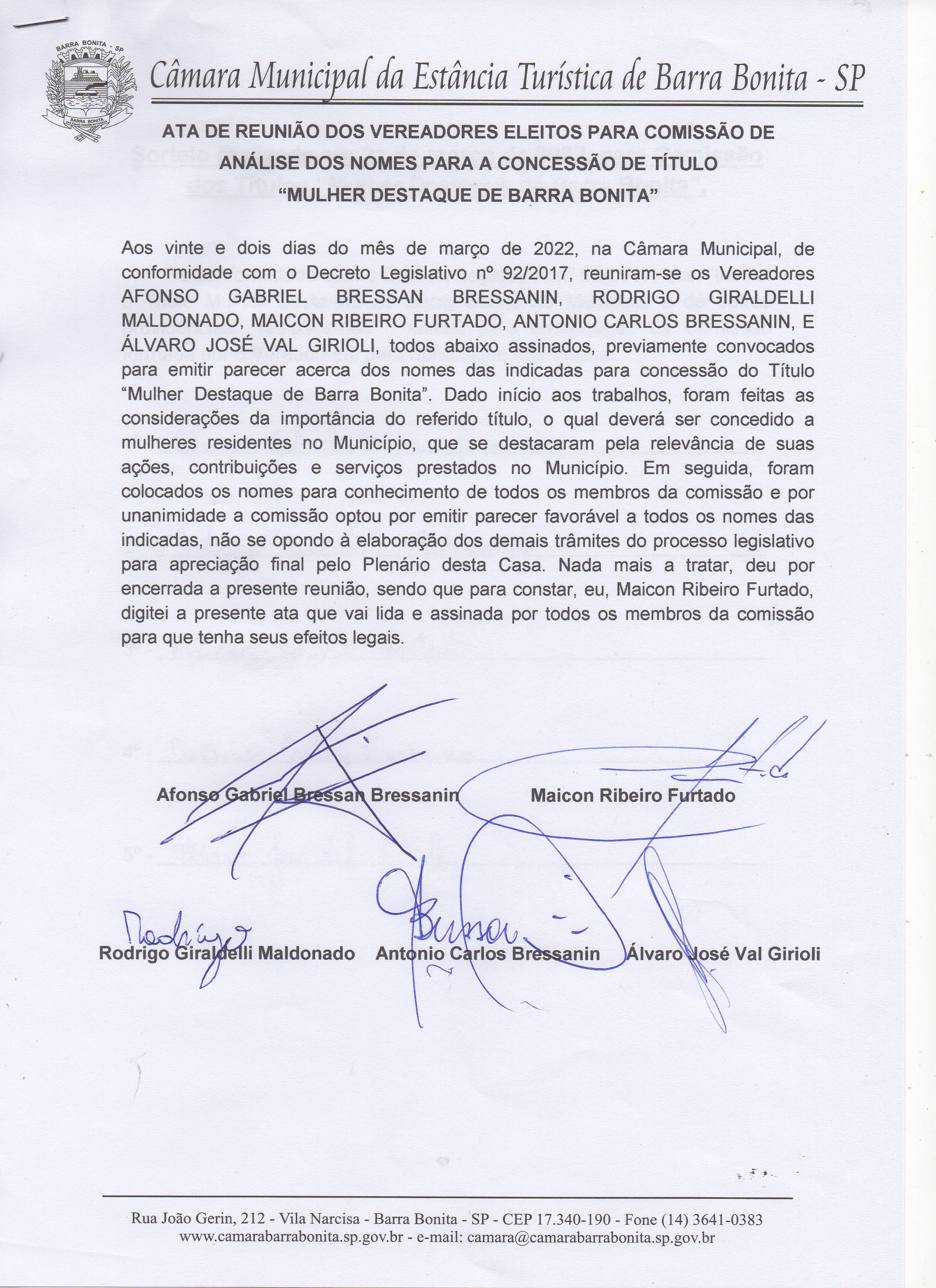 Assunto: “CONCEDE TÍTULO DE CIDADÃ BARRA-BONITENSE E DÁ OUTRAS PROVIDÊNCIAS”. Vanessa da Silva Galvão